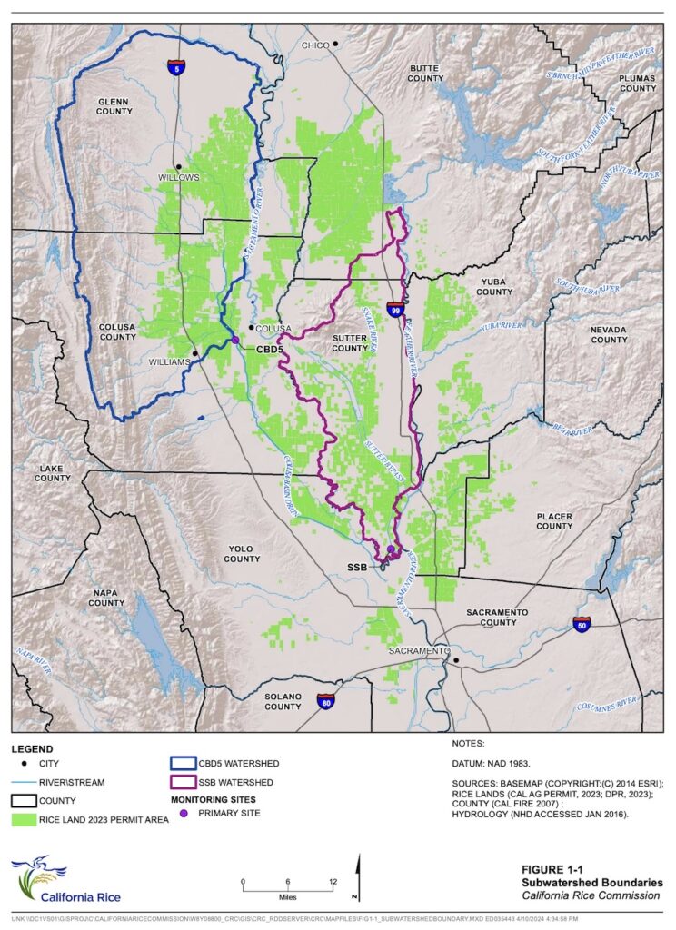 The California Rice Commission has a Surface Water Quality Management Plan for Pyrethroids for rice acres that drain to the monitoring locations at upper Colusa Basin Drain (CBD5) and the Sacramento Slough near Karnak (SSB). The upper Colusa Basin Drain (CBD5) sub-watershed is generally west of the Sacramento River and north of Highway 20. The Sacramento Slough (SSB) sub-watershed is generally east of the Sacramento River, west of the Feather River, and south of the Sutter Buttes.