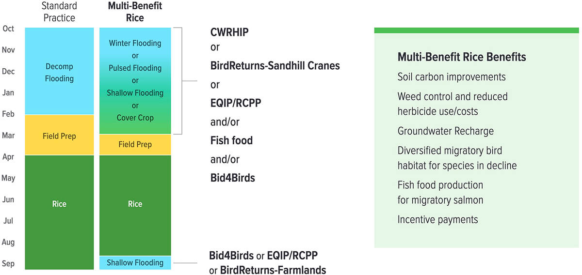 Participants are required to flood rice fields or wetlands to at least 10 inches of water and then wait 3 or more weeks for the invertebrate communities to develop in this floodplain. The bug-rich water is then drained back into the river where the fish are. This cycle can be repeated up to 3 times over the course of a winter. Concurrent enrollment in NRCS and CWRHIP programs is allowed. Payment rates for this program vary as it is run as a reverse auction – interested growers submit bids that are informed by their unique costs and individual circumstances.